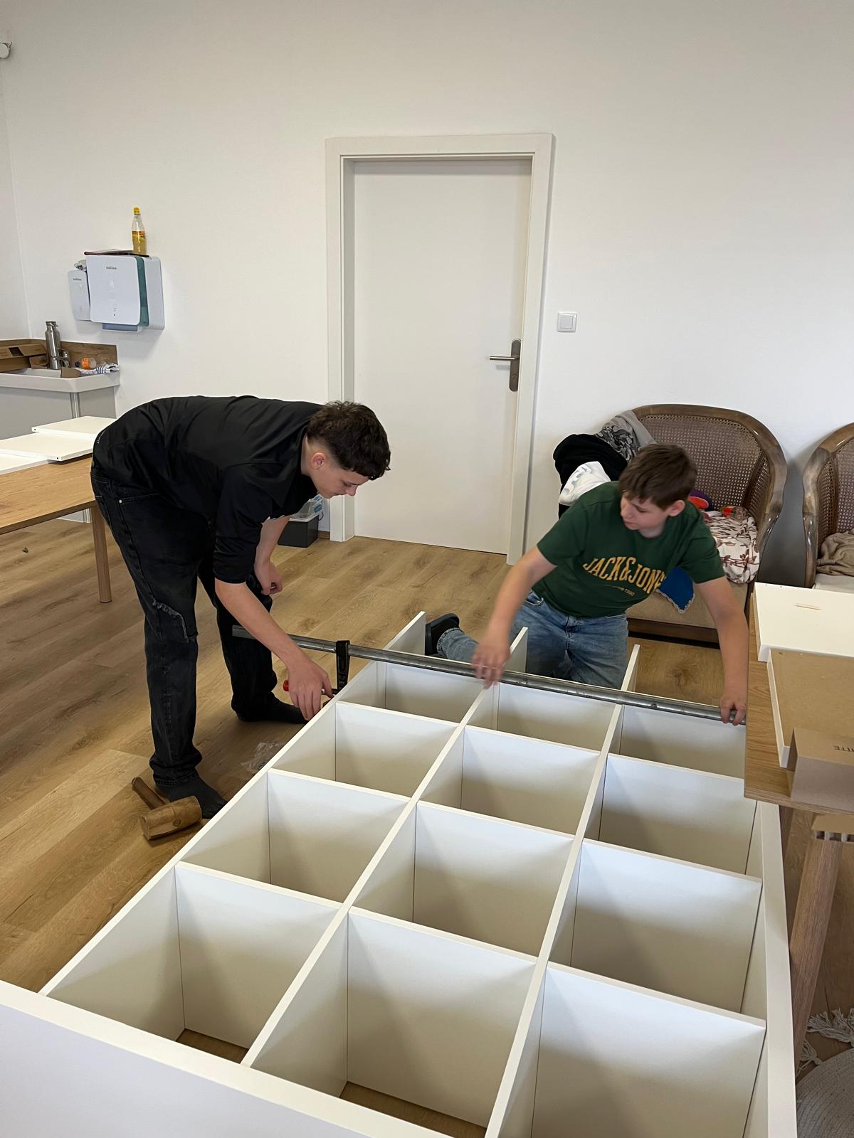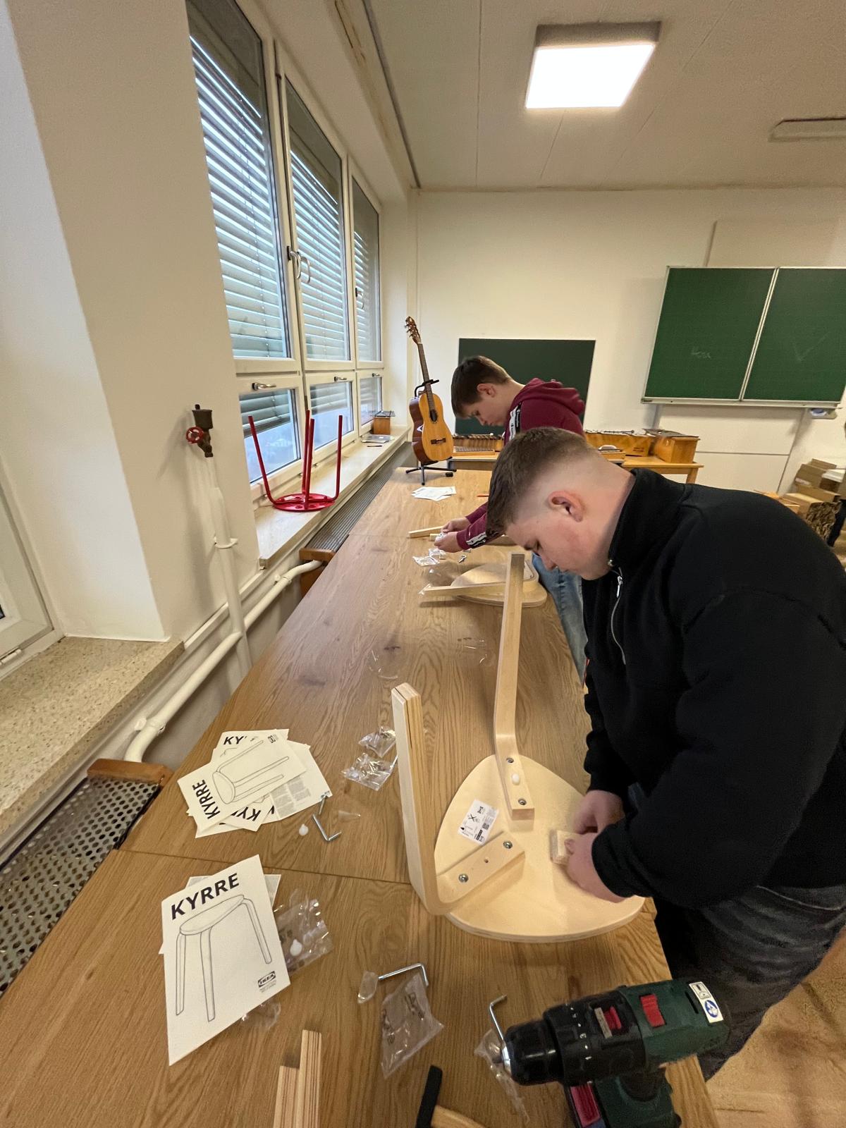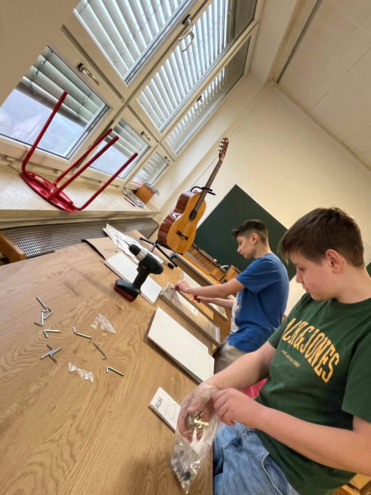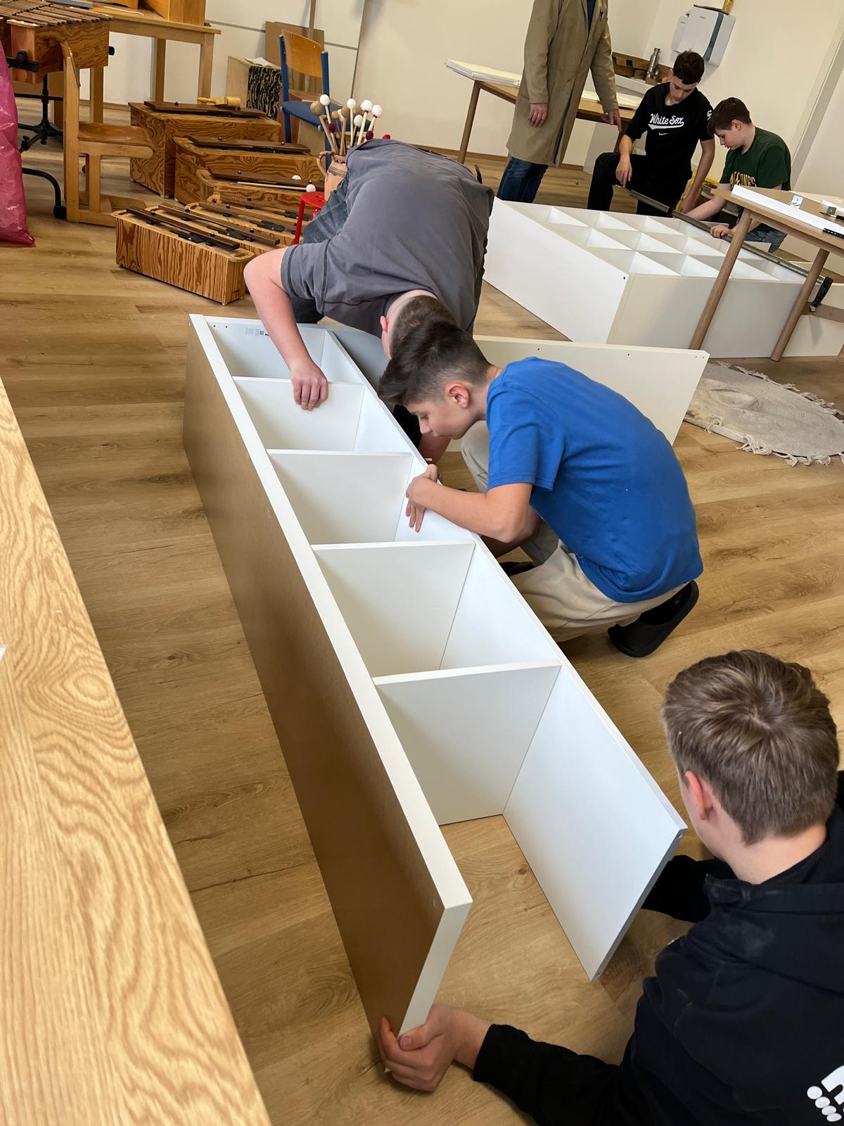 Im Rahmen eines Kooperationsprojekts bauten einige Schüler unserer 4. Klasse unter der fachkundigen Anleitung von Herrn Dipl.-Päd. Martin Wratschko Möbel für die neue Bibliothek der Volksschule Ehrenhausen zusammen.